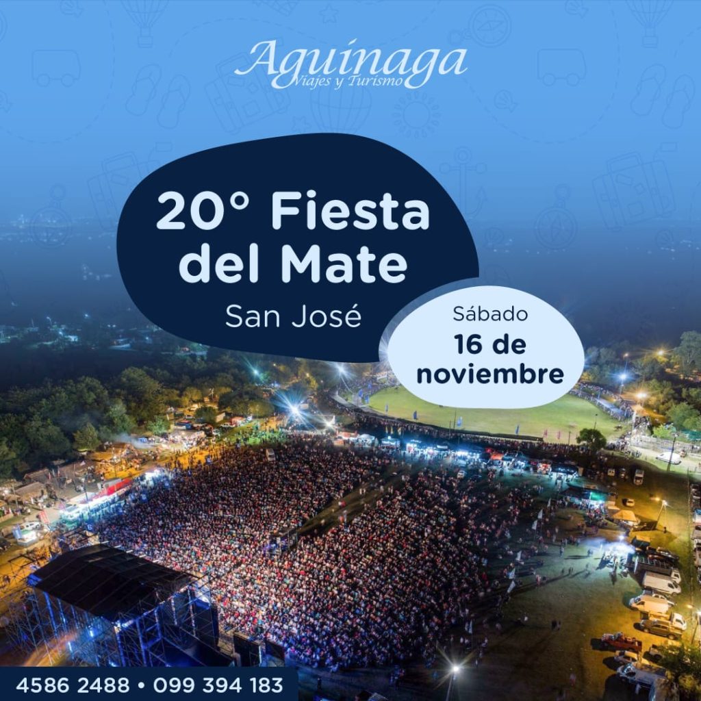 Aguinaga Viajes y Turismo te invita a viajar a La 20° Fiesta del Mate en San José el sábado 16 de noviembre. Reservá tu lugar por el 4586 2488 y 099 394 183.