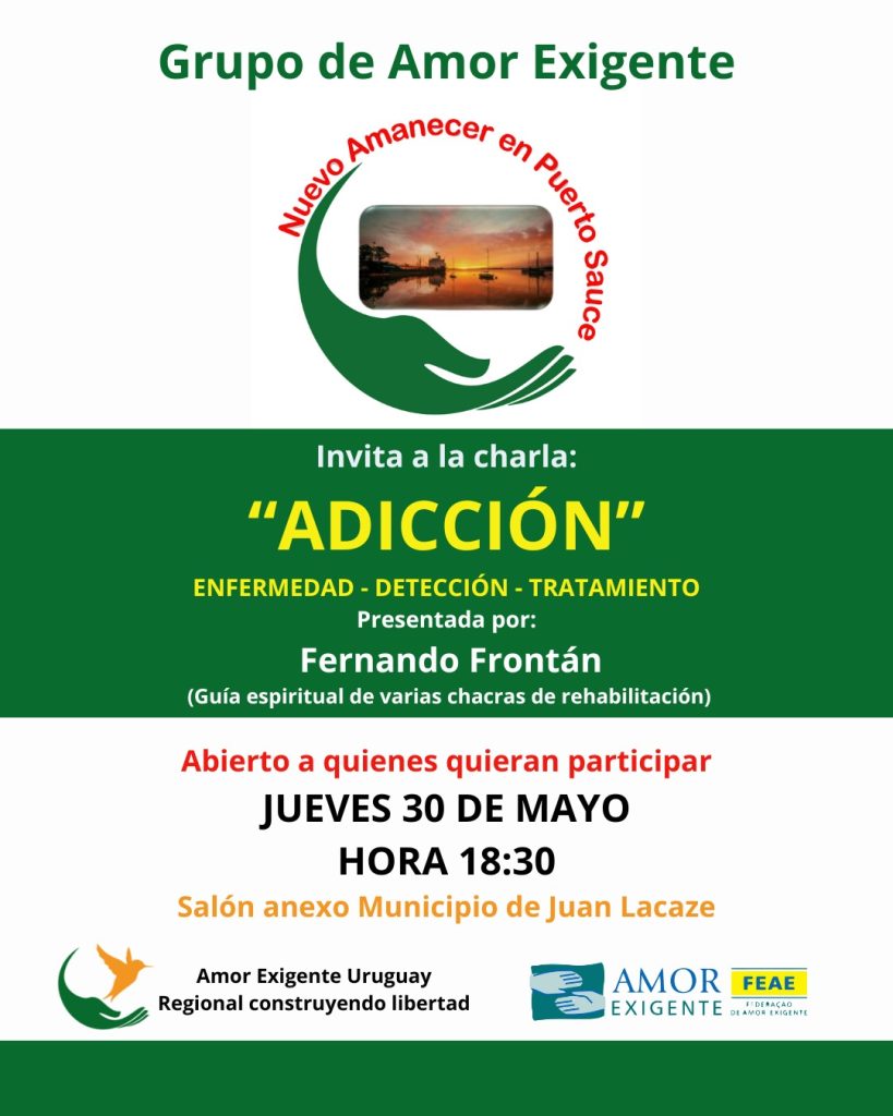 El Grupo de Amor Exigente “Nuevo Amanecer en Puerto Sauce” de Juan Lacaze invita a la charla sobre “Adicción” que se realizará el jueves 30 de mayo a las 18:30 en el local Anexo al Municipio de Juan Lacaze.