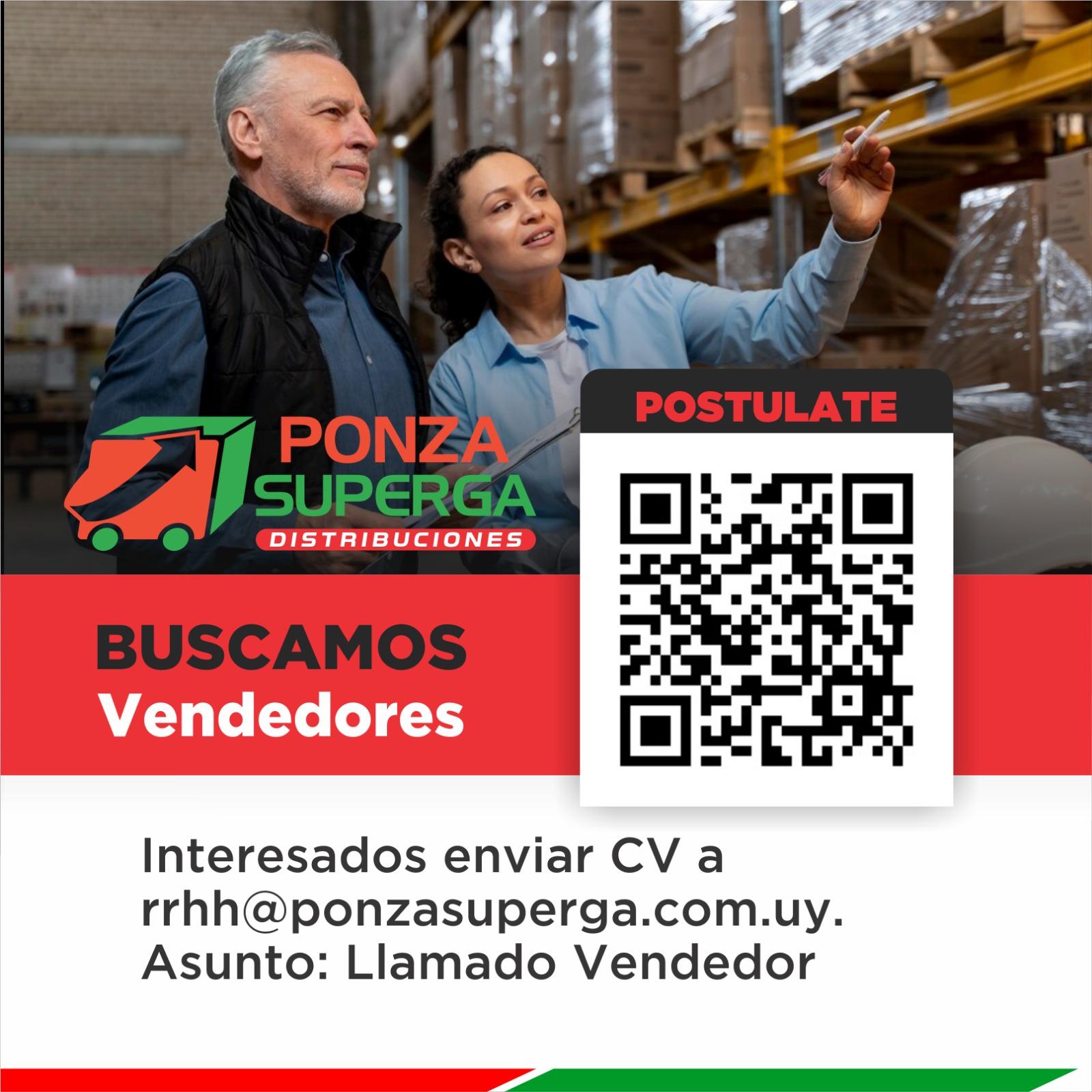 Si te interesa la posición, enviá tu CV a rrhh@ponzasuperga.com.uy con el asunto “Llamado Vendedor”.