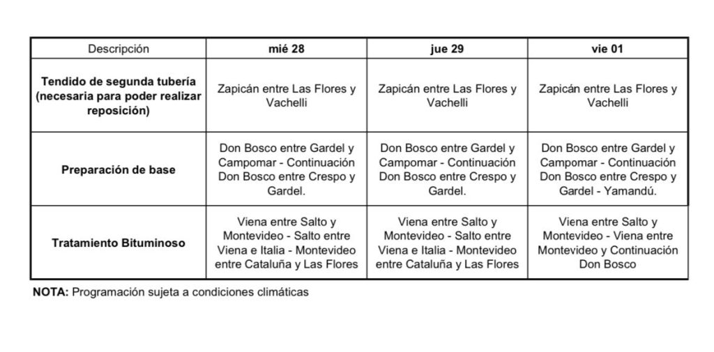 El Municipio de Juan Lacaze informa a la población que la empresa Teyma estará realizando las siguientes tareas desde el miércoles 28 de febrero al viernes 1 de marzo.